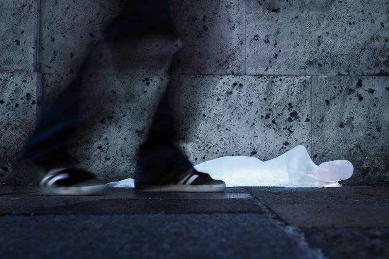 In ihrer Installation VON GESTERN ging sie konsequent einen Schritt weiter und entschied sich bereits bei der Konzeption ihrer Figur für deren Auflösung. Während die Eisskulptur schmilzt, sammeln sich ihre „Überreste“ als Pfütze in einem Becken, sie löst sich auf und ist doch präsent. Kallage Götze möchte zum Betrachter und zur Betrachterin sprechen, mit ihren Figuren und Installationen erzählt sie Geschichten. .....