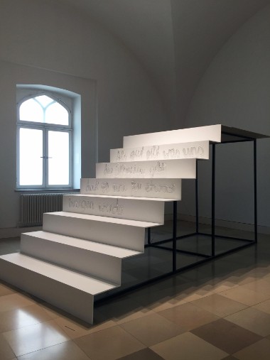 The title of the seated figure Himmelschwer gives the whole installation its name. The associations are numerous, the possibilities of interpretation infinite. The artist seems to want to provoke this ambiguity. Nevertheless, a fairy-tale-like naivety lies behind this provocation, as if the figures were independent in their speech and actively proclaimed their own artistic message. They stand not only as 'creatures' in the room, they are also creators. They are a doubling of the artist, who in fact was the model for the mould. In this manner, they are also doppelgangers of the viewer. They have a material presence and at the same time establish a distance to the observer. As such they make an intellectual gesture that stands for the 'indifference" and 'purposelessness' that Kant attributed to aesthetic judgement.